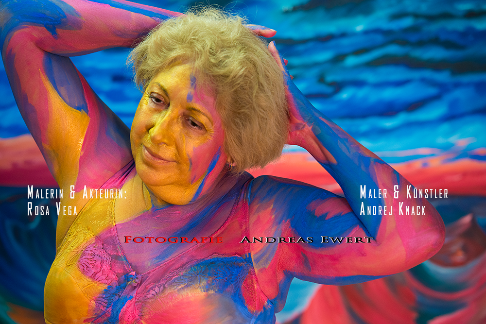 El arte no conoce fronteras no hay edad y sin inhibiciones, no tiene religión, desde su libertad no posee límites para crear su obra arte. A partir de esa premisa, tres artistas de distintas NACIONALIDADES se unen, ROSA VEGA ARGENTINA artista plástica, cantante, actriz, se coloca como modelo cual un lienzo, para que el artista plástico RUSO ALEMÁN ANDREJ KNACK pinte sobre el cuerpo de ROSA VEGA su arte integrando un cuadro con ella, lo que queda plasmado en las fotografías tomadas por el artista ALEMAN ANDREAS EWERT, tratando de estar siempre a la vanguardia ROSA VEGA DE ARGENTINA. En las fotografías se muestra el talento de los artistas. EL ENCUENTRO SE REALIZO en la galería ZEITKUNST DE BADEN BADEN EN ALEMANIA con la presencia del director PETER SOMMERFELD. |